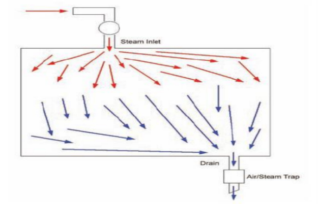 滅菌柜腔室中的冷空氣比進(jìn)入的蒸汽重,因而下沉到腔室的底部。蒸汽從滅菌柜上部進(jìn)入腔室,迫使冷空氣從腔室底部的排水管排出。也就是我們通常所說的“置換”,如下圖。
